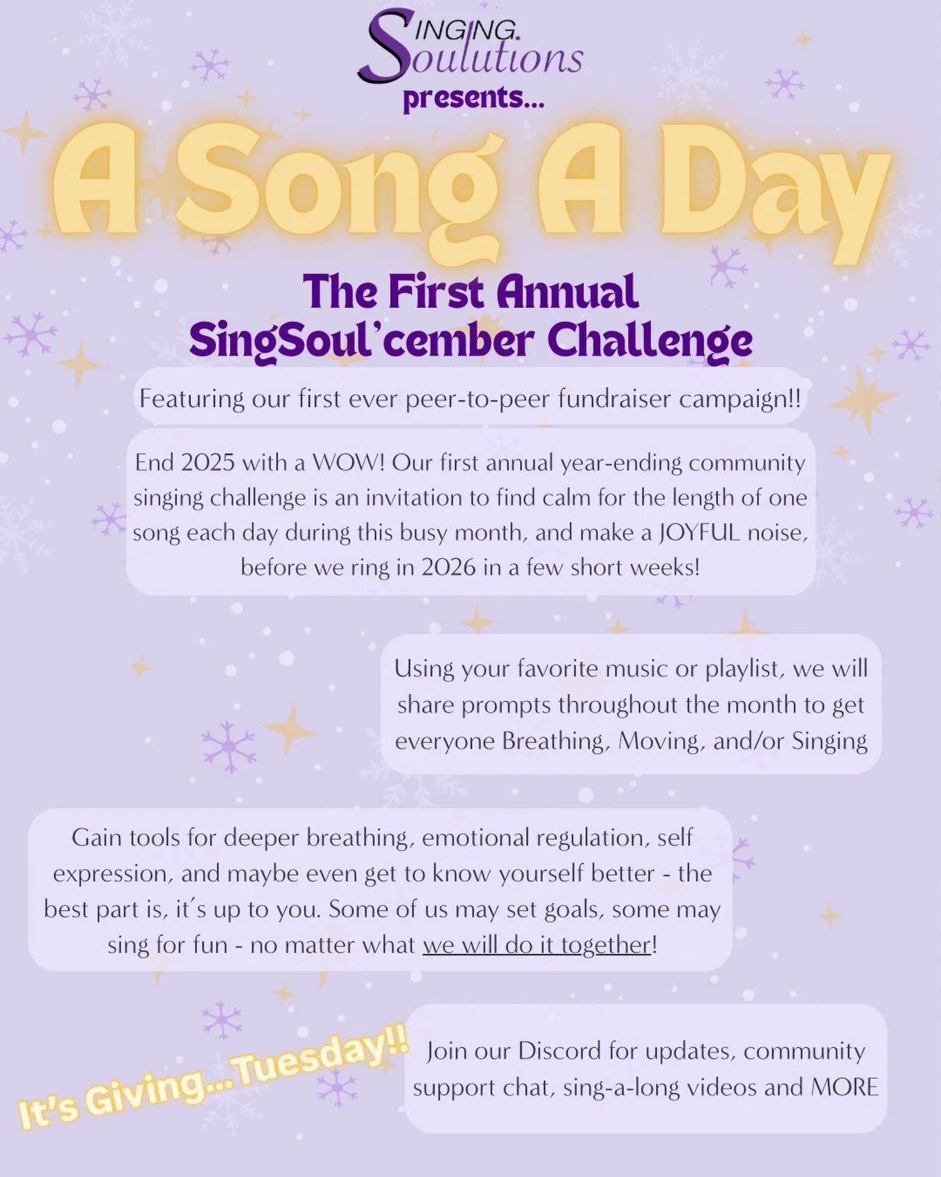 End 2025 with a WOW! Our first annual year-ending community singing challenge is an invitation to find calm for the length of one song each day during this busy month, and make a JOYFUL noise, before we ring in 2026!